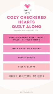 • It’s week 2 of the #cozycheckeredheartsqal  This week we are moving on to our heart blocks.  Hopefully you have a good start or are finished with your nine patch blocks.